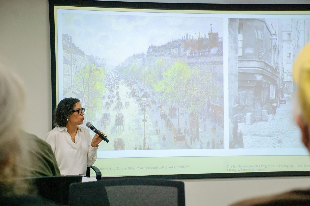 Boutin, an expert in 19th-century French studies, opened the lecture by exploring the history of the flâneur. She described the kaleidoscopic encounters of figures in French literature who wandered through Paris, treating the sights and sounds of the city as a “sensory feast.”