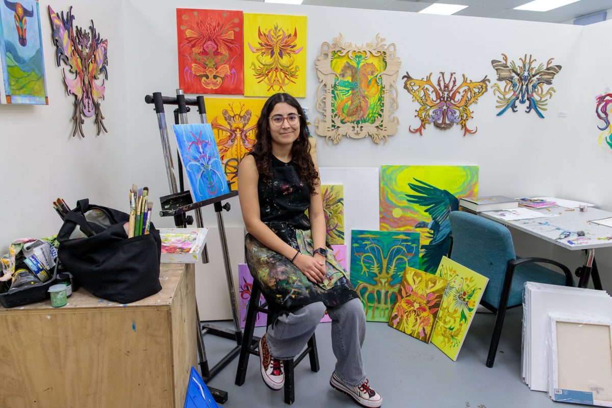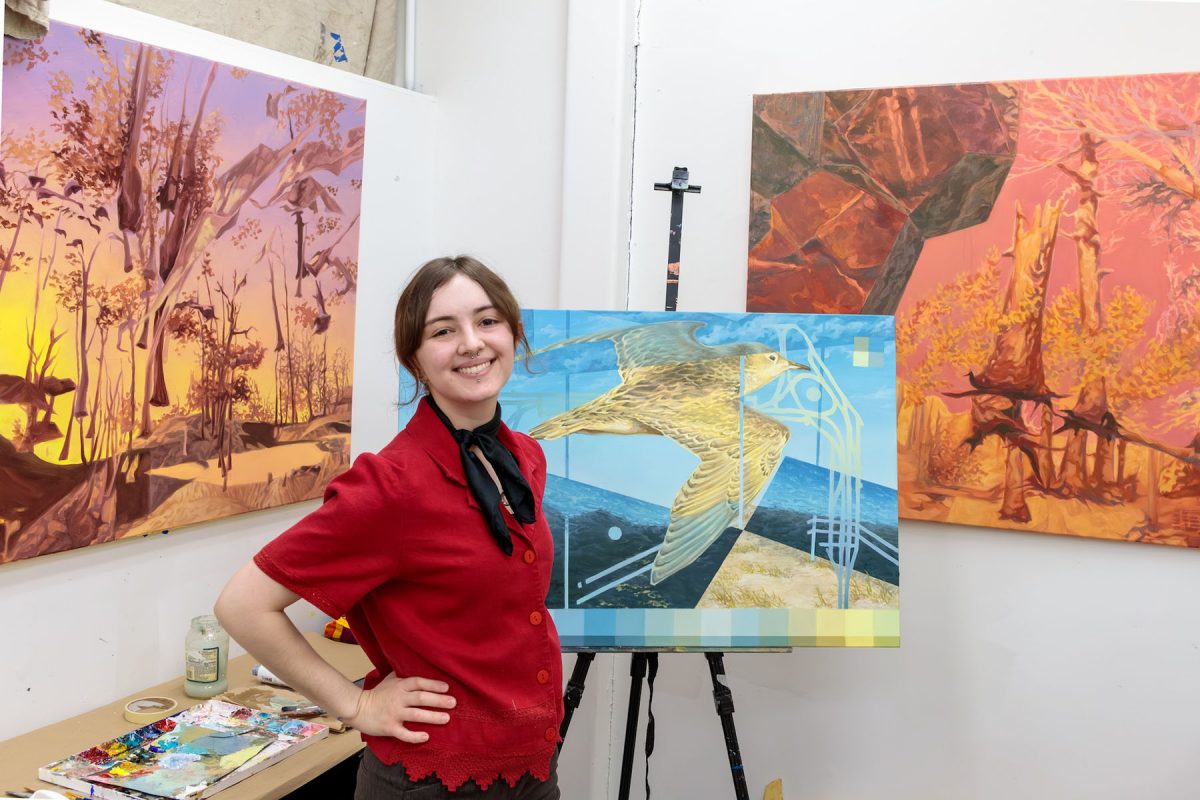 The collaborative exhibition, entitled “A New Paradigm,” features artwork by eight graduating BFA students: Alex Davidoff, Addison Ellis, Audrey Femia, Audrey Lendvay, Antonia Pretelt, Joanna Godfrey, Leah Linkogle and Mari Mitchell.