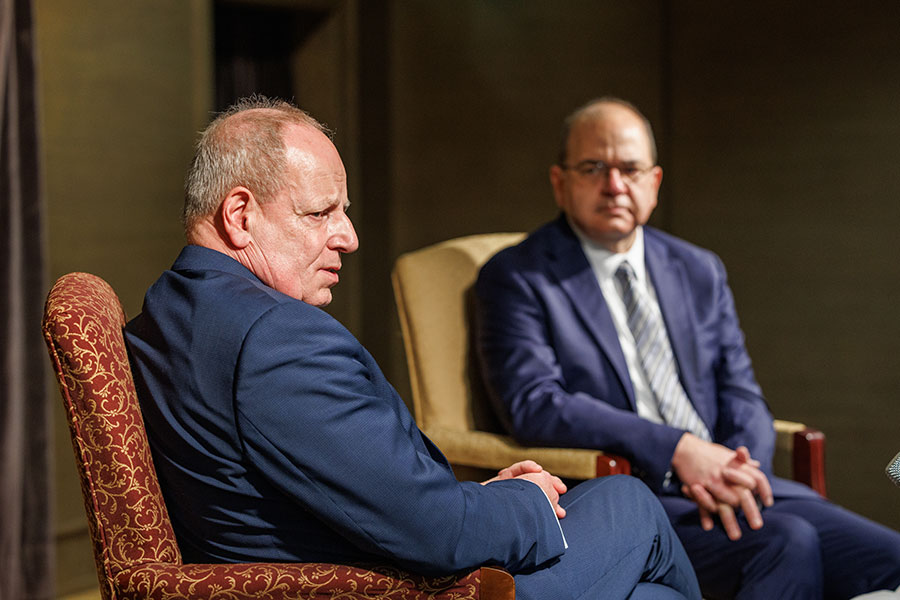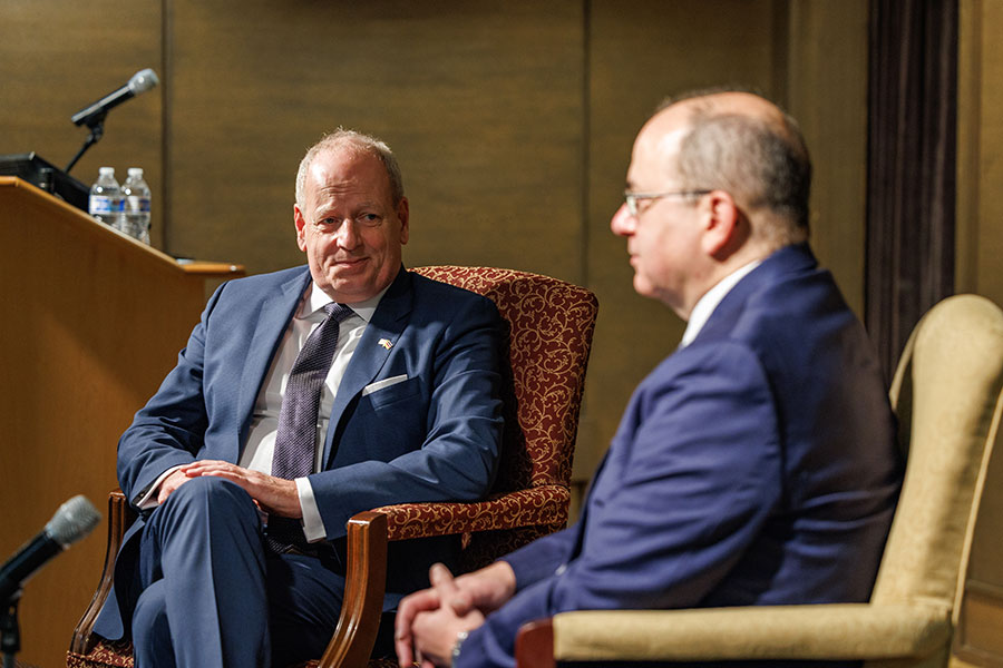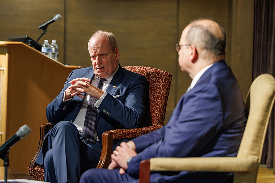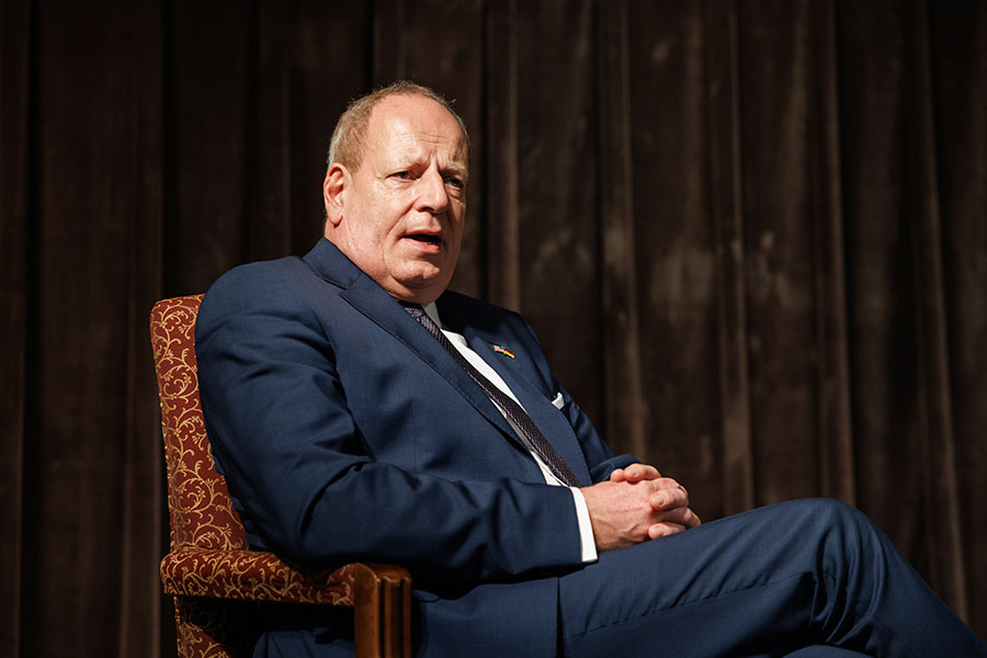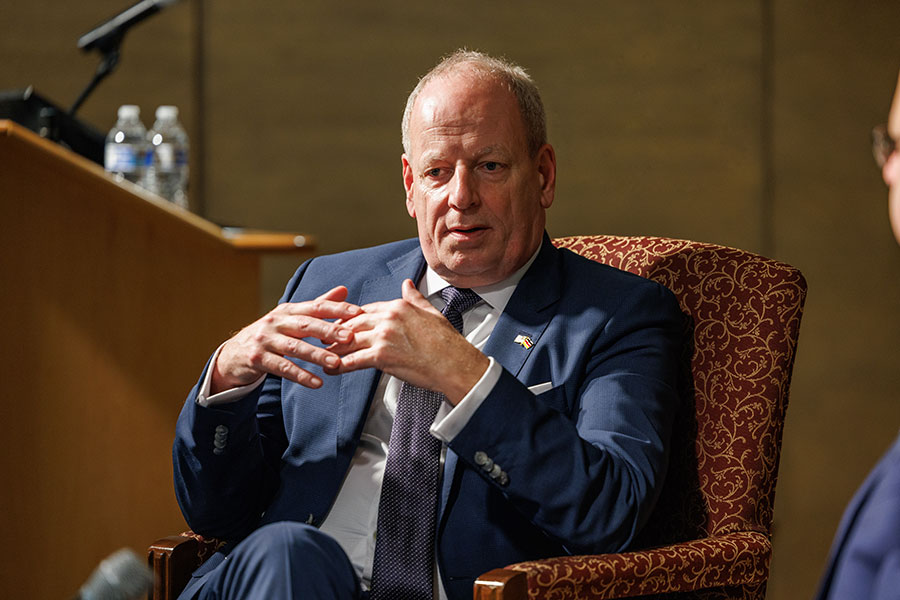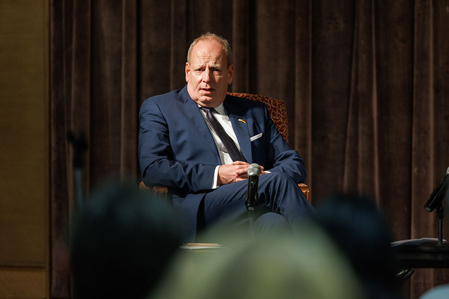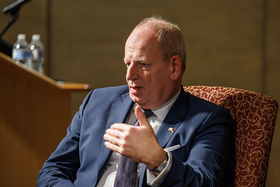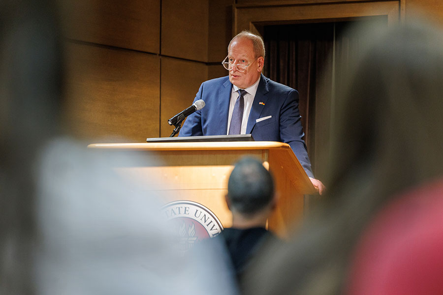 Following his talk, which took place in The Globe Auditorium, Hanefeld engaged in a discussion with students, answering questions ranging from the war in Ukraine and Russian oil dependency to career paths in foreign service. Brad T. Gomez, associate professor and chair of the Department of Political Science in the College of Social Sciences and Public Policy, introduced Ambassador Hanefeld and moderated the question and answer portion.