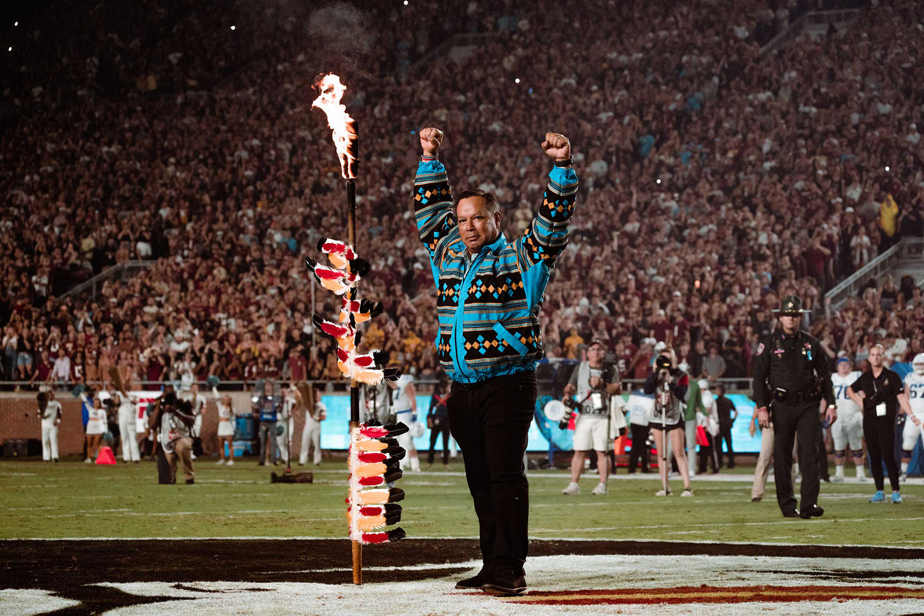 In 2014, the collaboration expanded to the redesign of FSU’s athletic uniforms, incorporating monochromatic replicas of three distinctive Seminole patchwork symbols: arrow, man on horse, and fire. Football players began wearing stickers featuring the Tribe’s official seal on their helmets, a visible sign of mutual respect and cooperation.