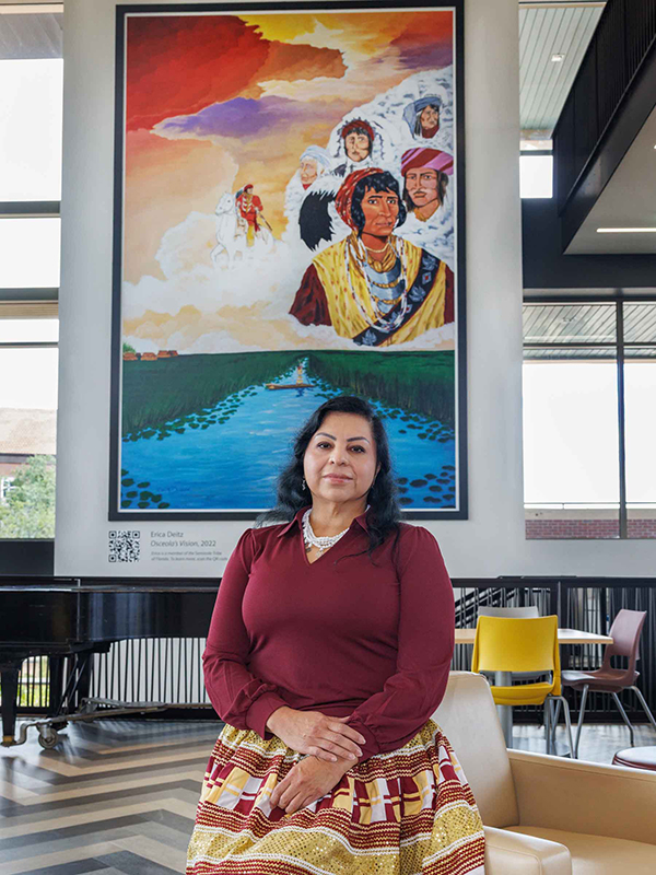 In recent years, the partnership between Florida State University and the Seminole Tribe of Florida has expanded beyond athletics, embedding itself within the academic and cultural fabric of the university. The ongoing relationship with the Seminole Tribe is reflected at the FSU Student Union, which, since 2022, features “Osceola’s Vision,” a striking 24-by-16-foot mural by Seminole artist Erica Deitz. Prominently displayed at the center of campus, the mural stands as a tribute to the Tribe and a visual reminder of the importance of honoring the Seminole name and legacy.